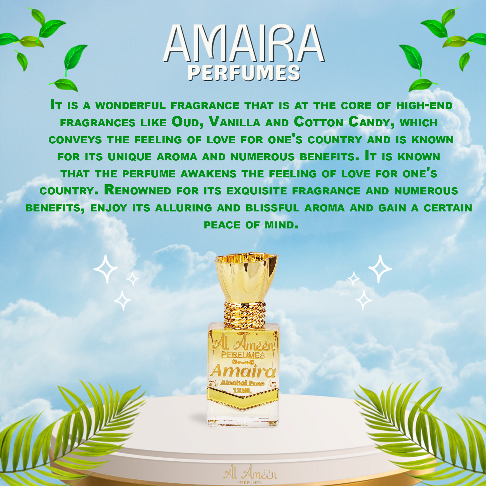 Amaira combines Oudh, Vanilla & Cotton Candy to create a fragrance that is playful yet sophisticated. Alcohol-free and long-lasting, it’s ideal for both men and women seeking a distinct signature scent.