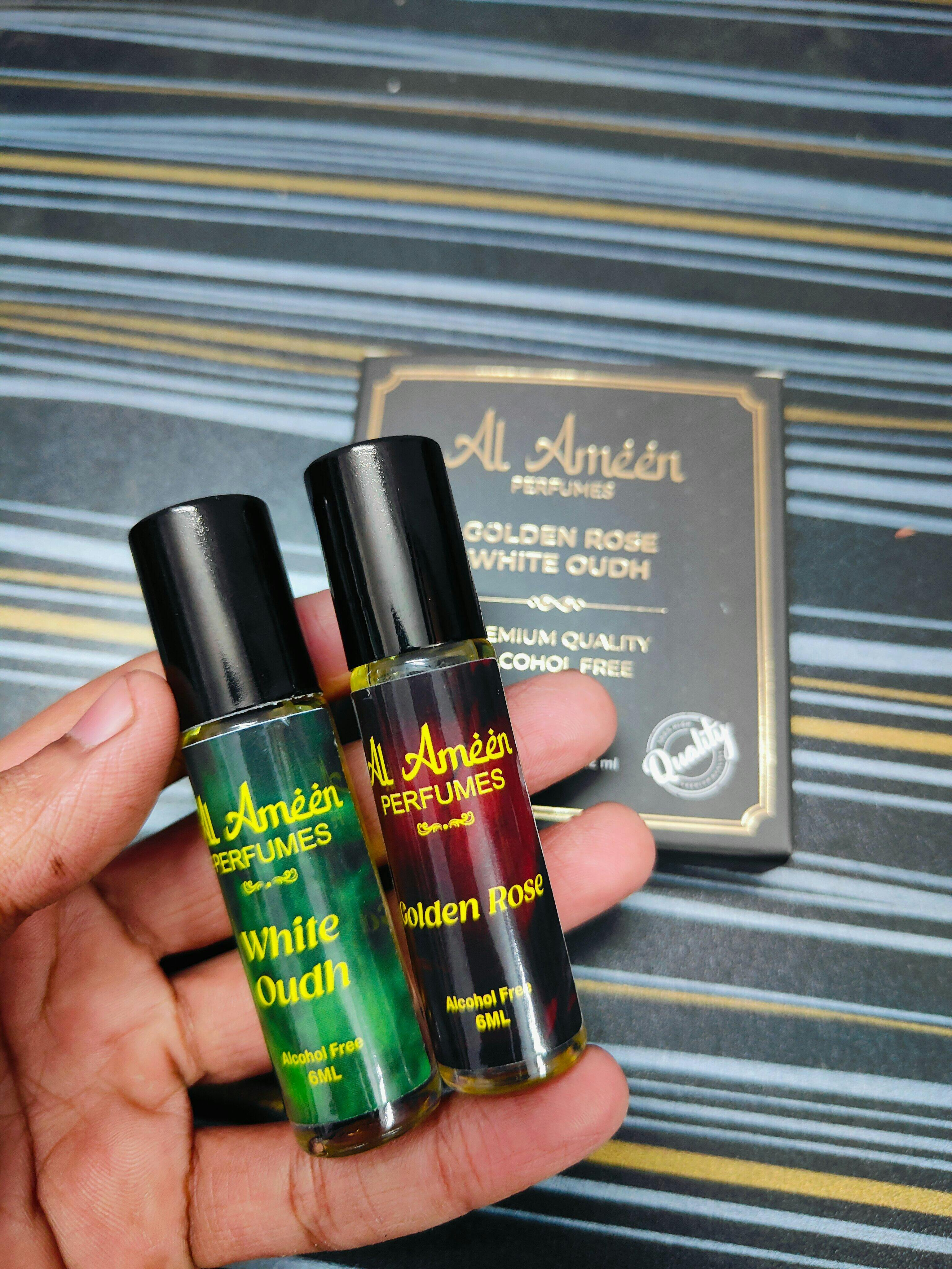 Experience timeless sophistication with the Duo of Elegance Luxury Attar Perfume Set, featuring Golden Rose and White Oudh. These two rich, alcohol-free attars deliver long-lasting freshness and depth. Golden Rose brings a floral sweetness, while White Oudh adds a deep, woody charm. Perfect for men and women who appreciate premium, long-lasting roll-on attars. A beautiful fragrance gift set for any occasion.